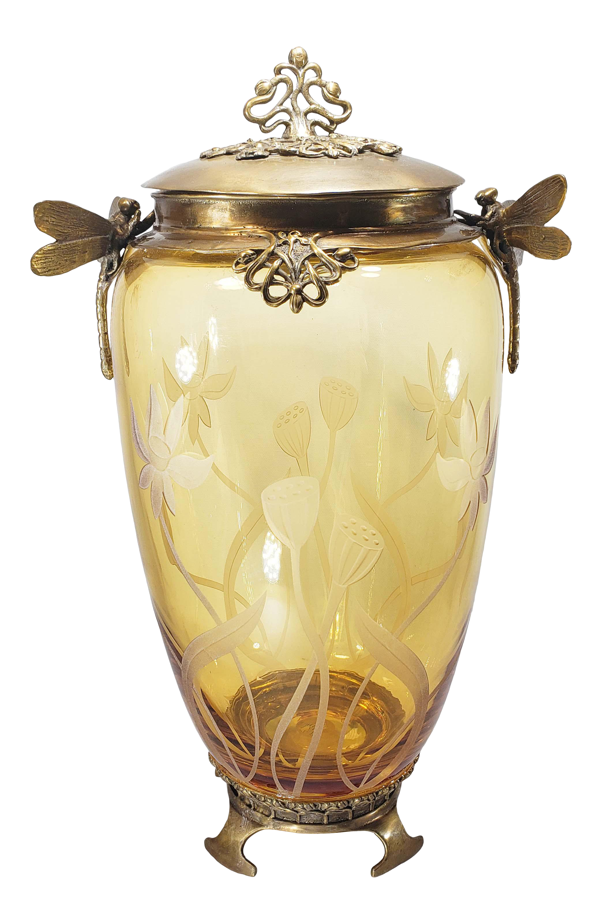 1950s Vintage Castilian Imports Dragonfly Bronze Cut Amber Urn